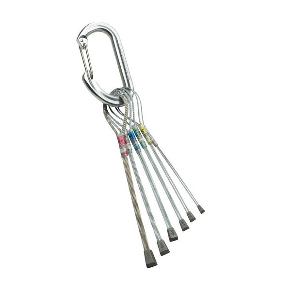 A full set of Micro Stoppers on an OvalWire carabiner. Versatile thin crack pro, trapezoidal Black Diamond Micro Stoppers feature a subtle curve on their longest face for maintaining utility in near-parallel cracks while still catching on crystals and irregularities. Each Micro Stopper is equipped with a durable, galvanized steel cable.