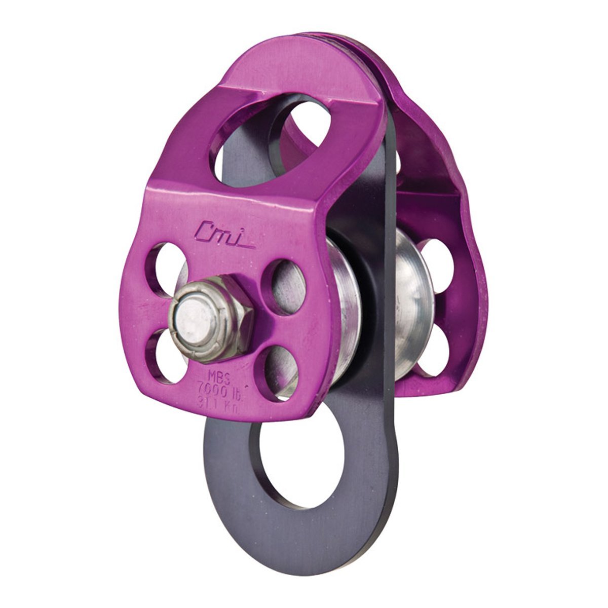 Double sheave rescue model. Purple anodized aluminum sideplates, two 1 1/4" aluminum sheaves, bushing and aluminum axle.