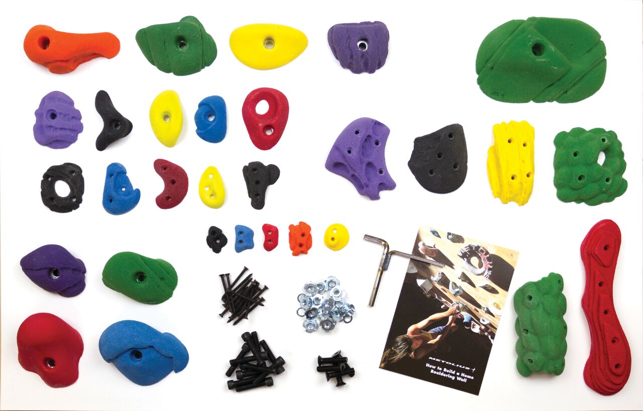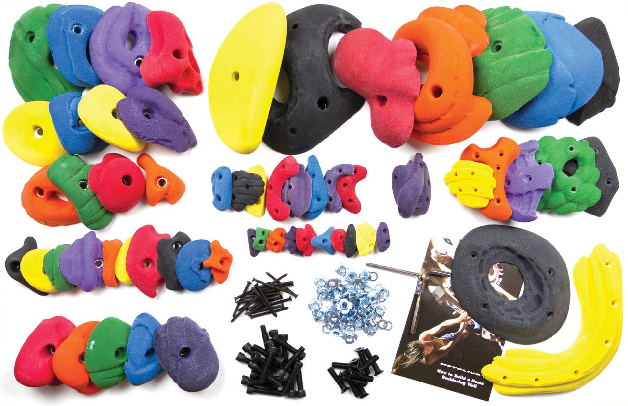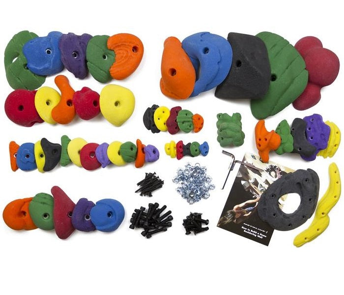 Incredible value, these climbing holds now come in bright, solid colors and are made with strong, polyurethane resin. Each Mega Pack Climbing Holds Set contains a random mix of various sizes of footholds, screw-on hand holds, modular holds, mini-jugs, macro or roof jugs and come with all the mounting hardware needed. Mega Packs are the ideal starter kit for your home climbing wall.
