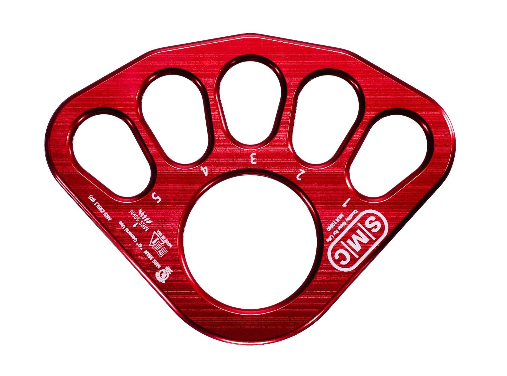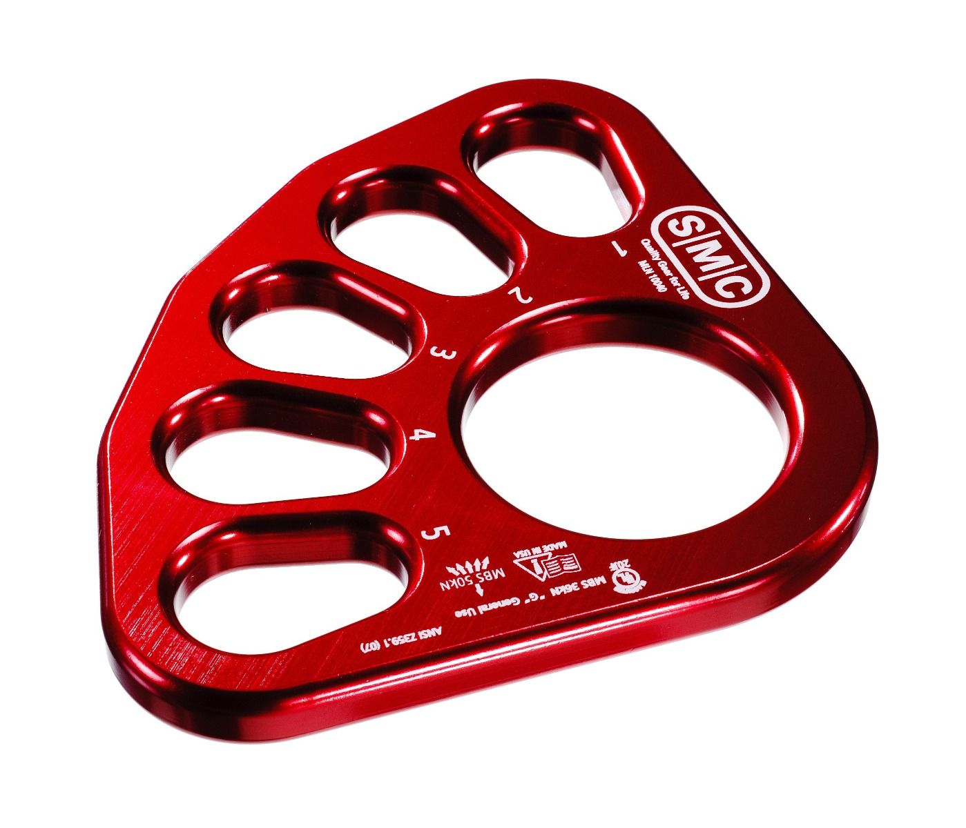 Rigging plates are indispensable and help make setting up a rope system quicker and safer. SMC's Rigging Plate is half the size of the bigger plates on the market yet it is just as strong. Features a single, large circular center hole that accepts numerous connections simultaneously plus five oversized, ovalized holes that are each designed to handle up to 2 large rescue. Holes are individually numbered to make it quick and easy to organize connections. All edges on the SMC Rigging Plate have been contoured so that they are easy on rope, webbing, carabiners and other connectors. CNC machined from 1/2'' thick aircraft quality aluminum and then anodized for quick identification and additional resistance to corrosion.