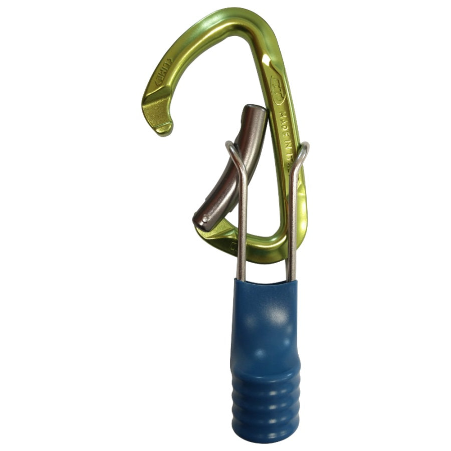 Can hold your carabiner open for attachment to an anchor or rope. To retrieve your carabiner or quickdraw, simply position superclip under the carabiner or quickdraw and push up to engage.